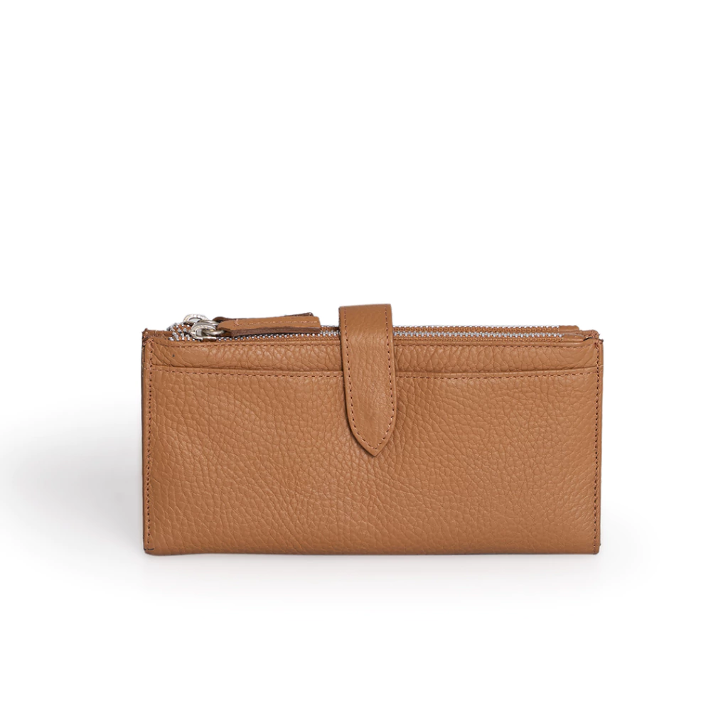 Billetera de cuero graneado con gran espacio para tarjetas, y monedas. Posee un broche interior.