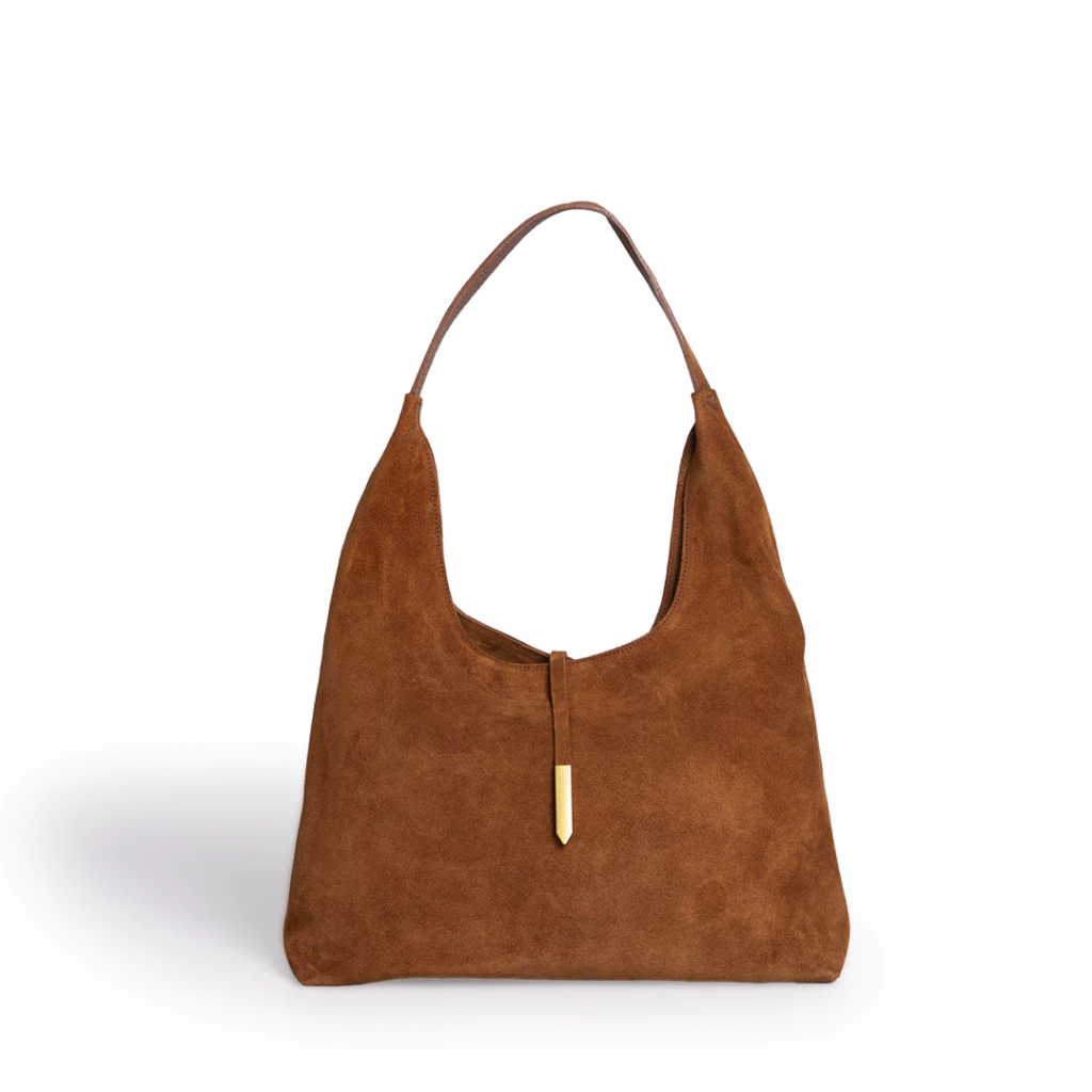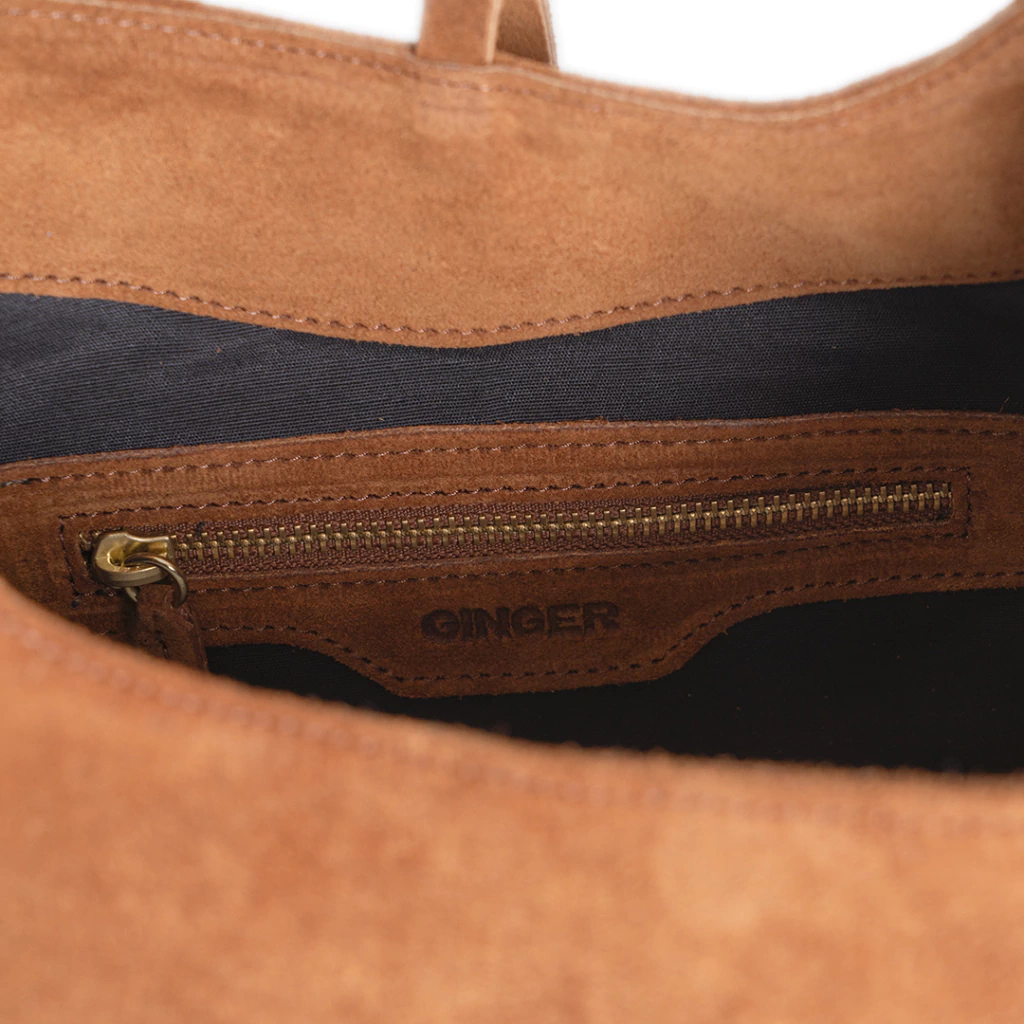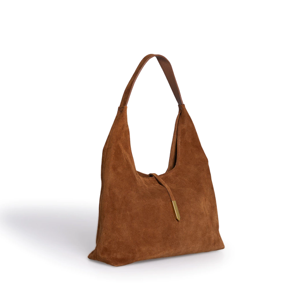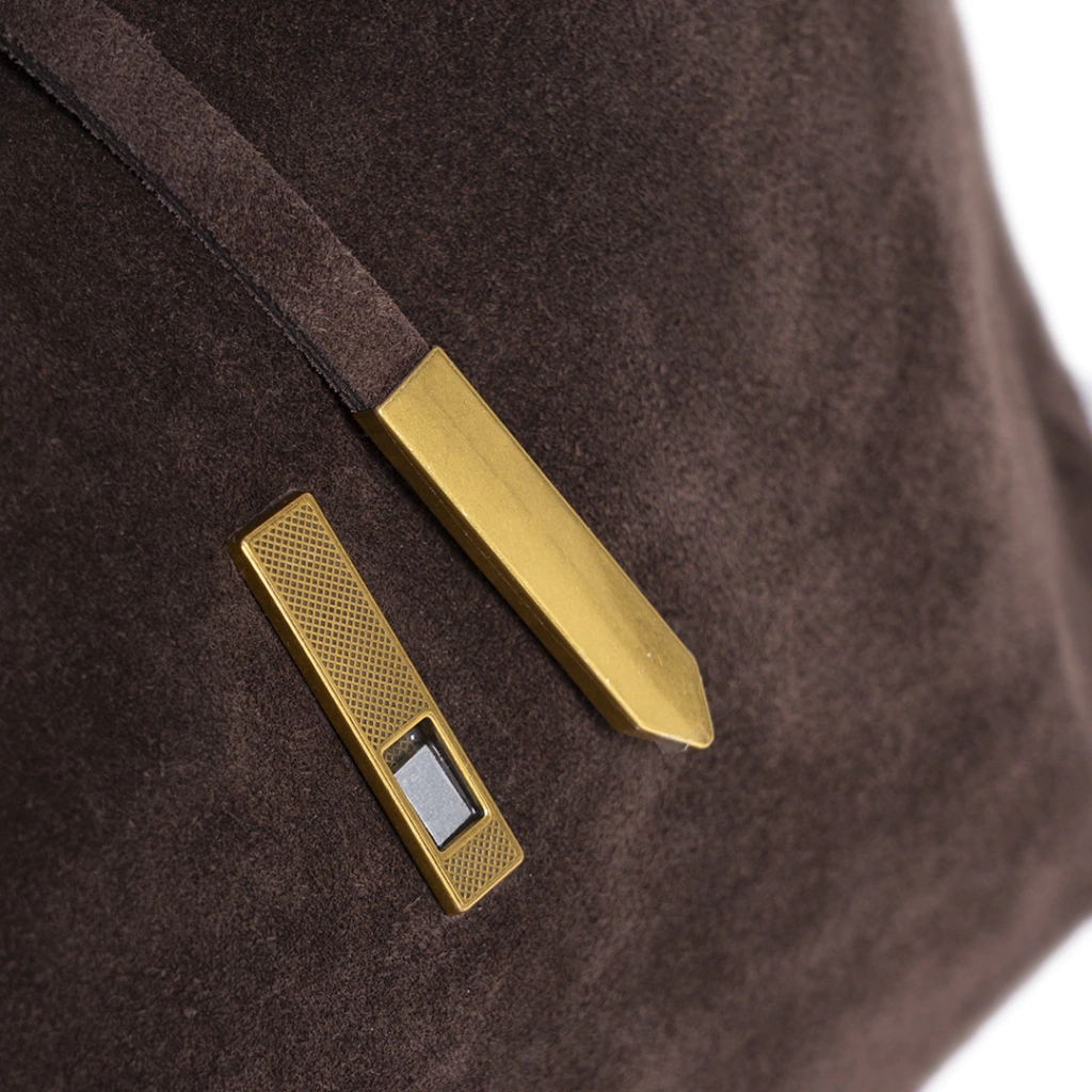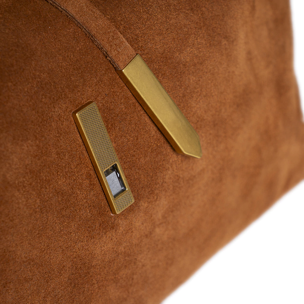 Cartera de gamuza forrada en tela. Cierre interno. Herraje imantado dorado para mantener la cartera cerrada.