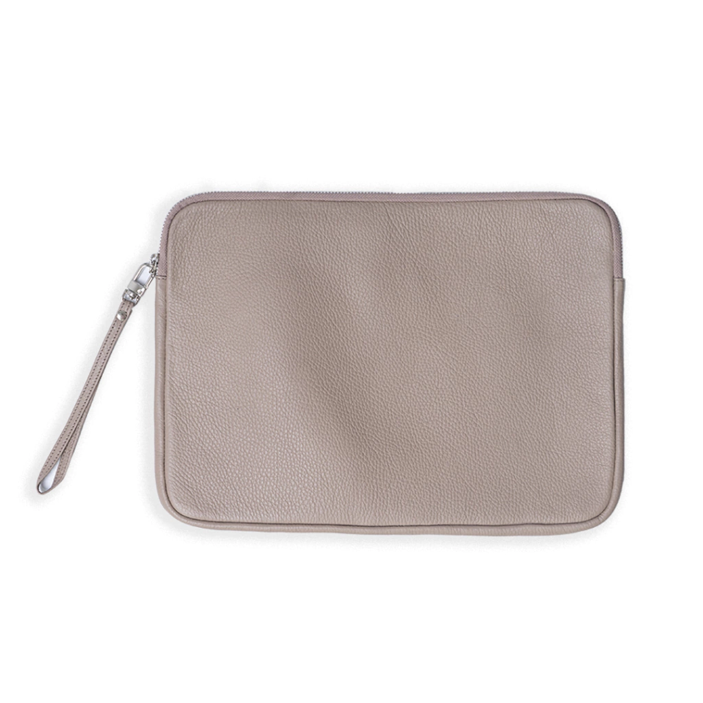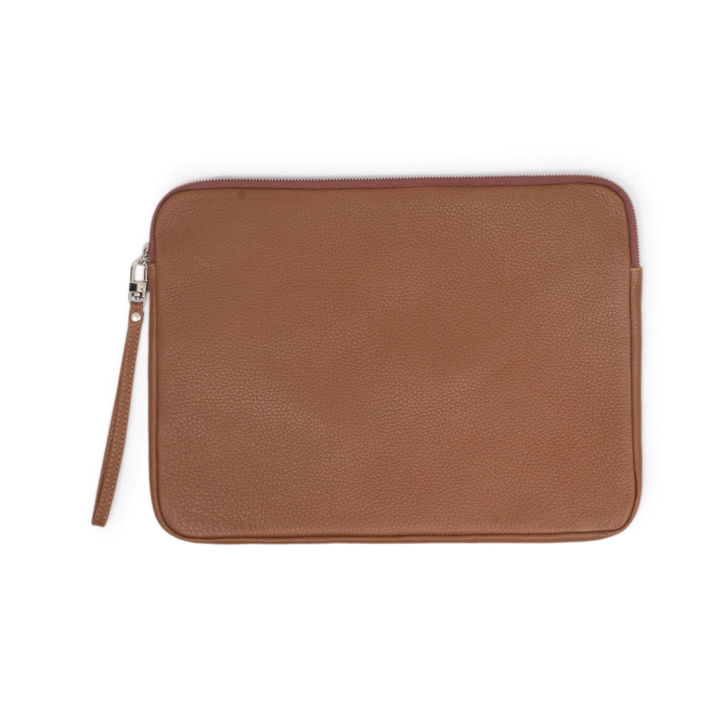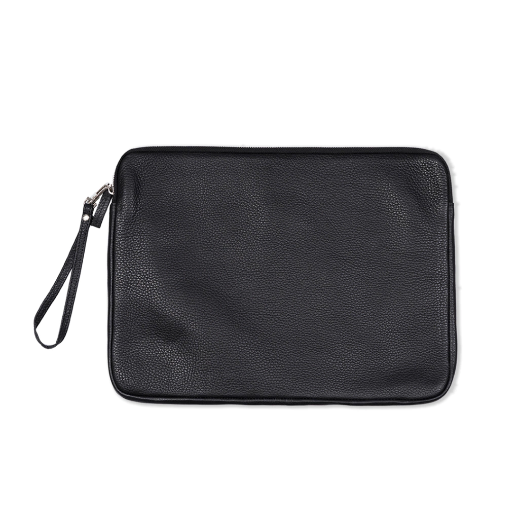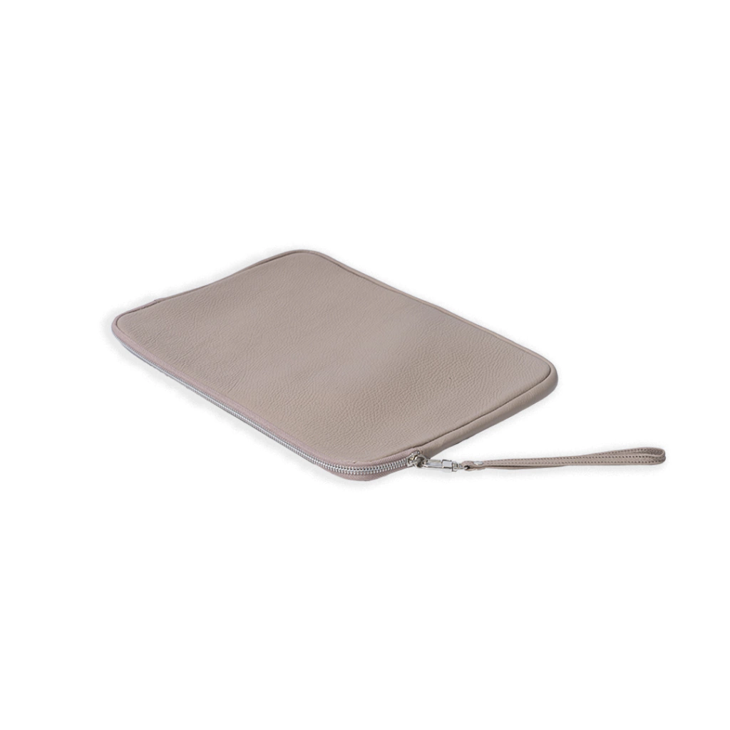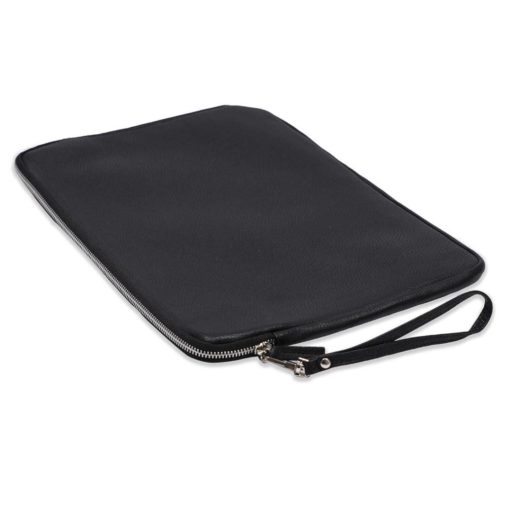 Funda de cuero graneado. Forrada en tela y con tira desmontable para su mejor agarre. Para laptop de 15 pulgadas.