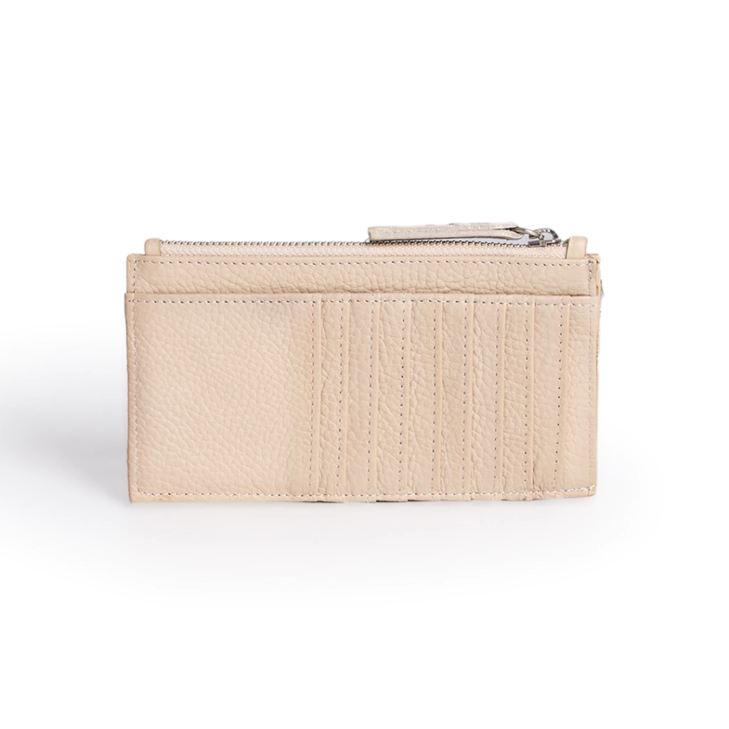 Tarjetero en cuero vacuno. Poseé espacio para varias tarjetas así como también un bolsillo con cierre para monedas o billetes y otro bolsillo externo.