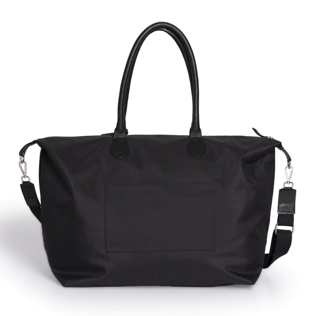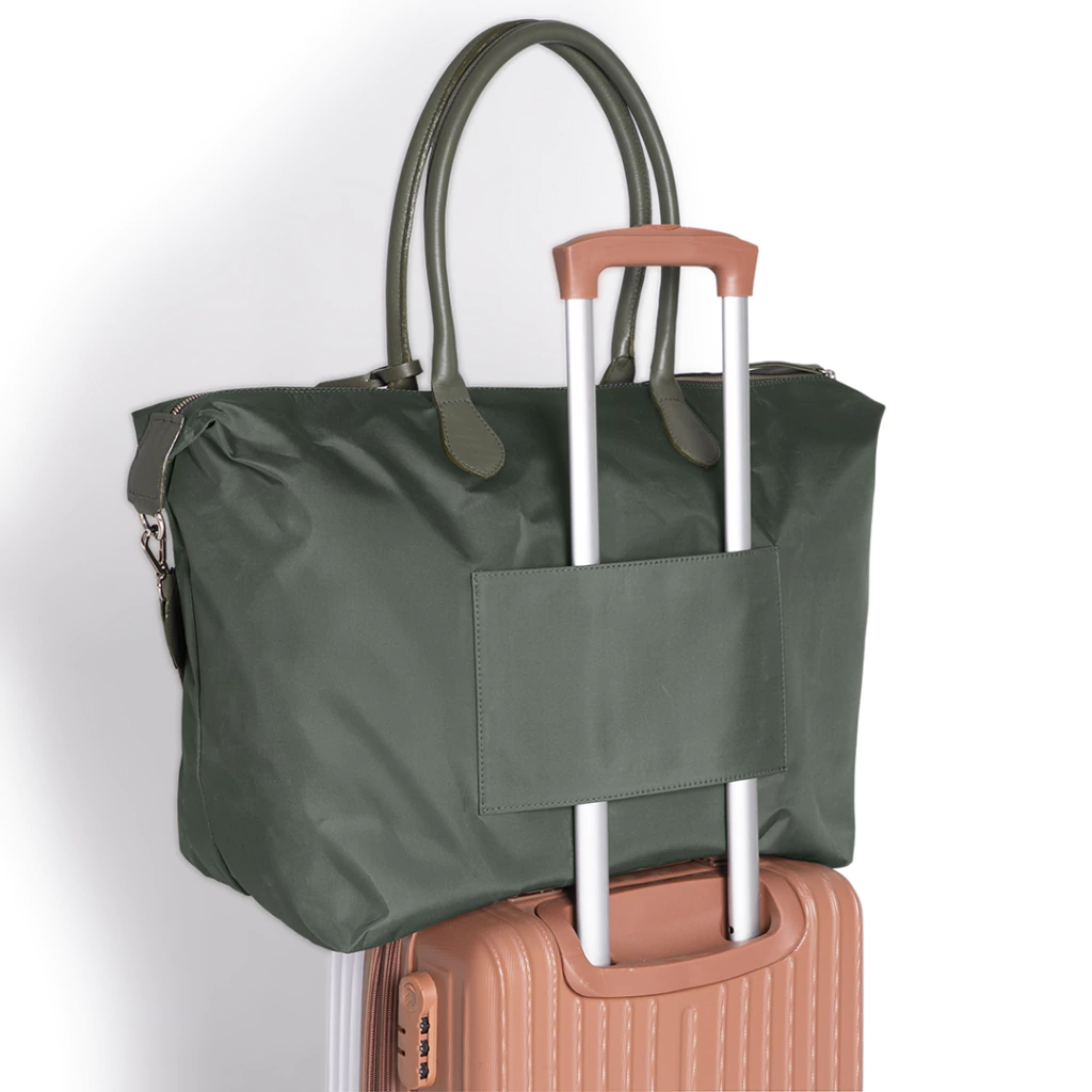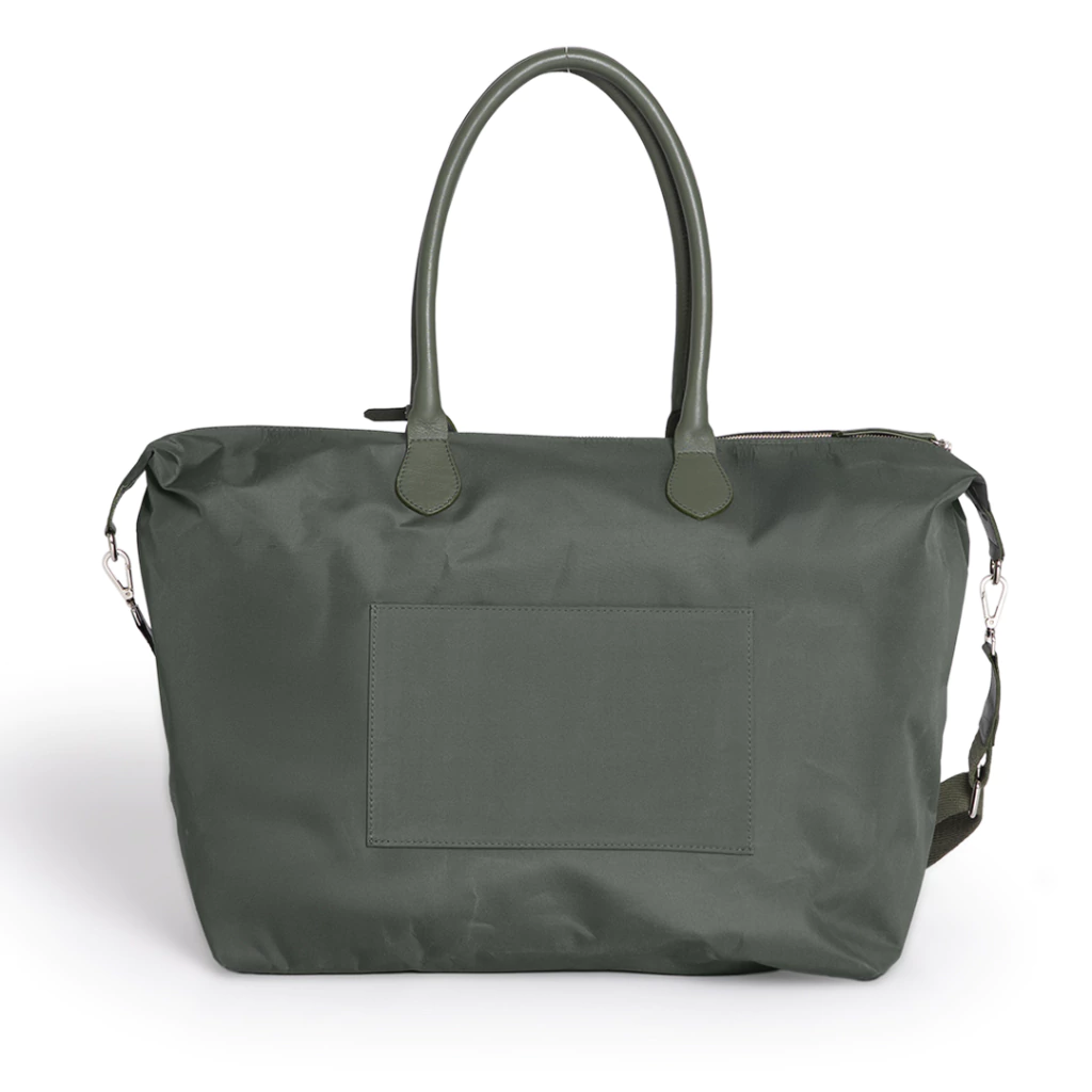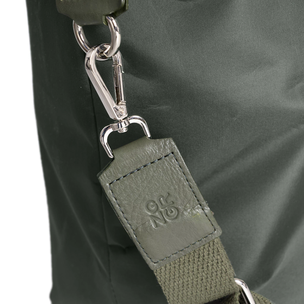Bolso de tela Impermeable con cierre. Trae manijas de cuero y una correa larga regulable extraídos de tela. Trae un mini tag donde se le puede grabar las iniciales. En su interior, trae 2 bolsillos, de los cuales uno es con cierre.