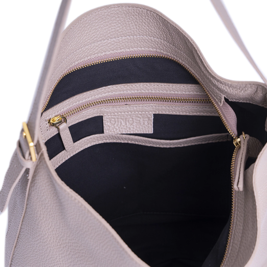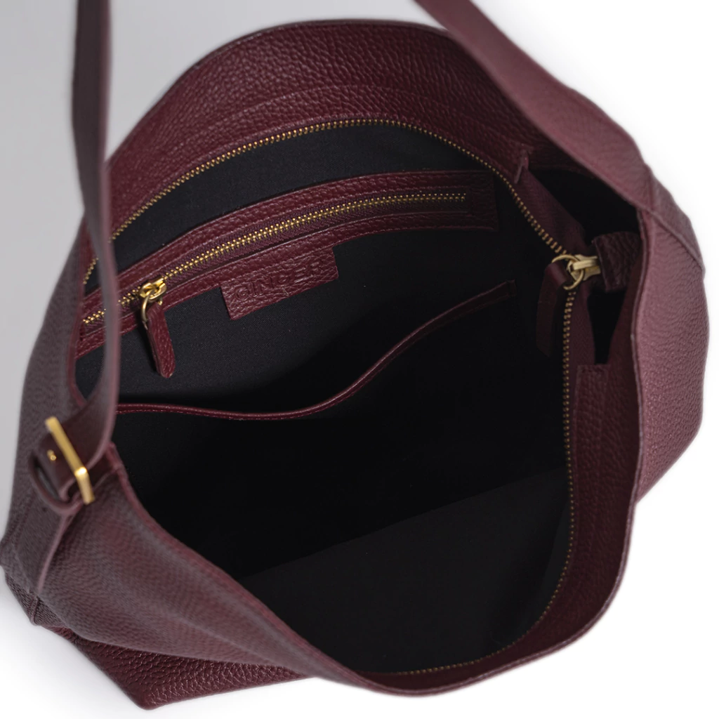 Cartera de cuero graneado . Cierre superior. Detalle en la correa regulable con hebilla dorada. Bolsillo con cierre interior.