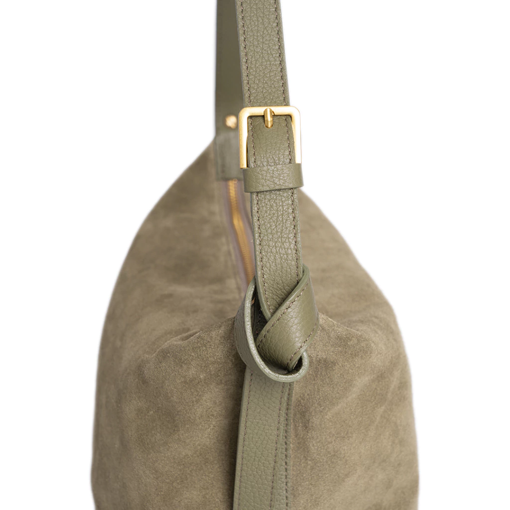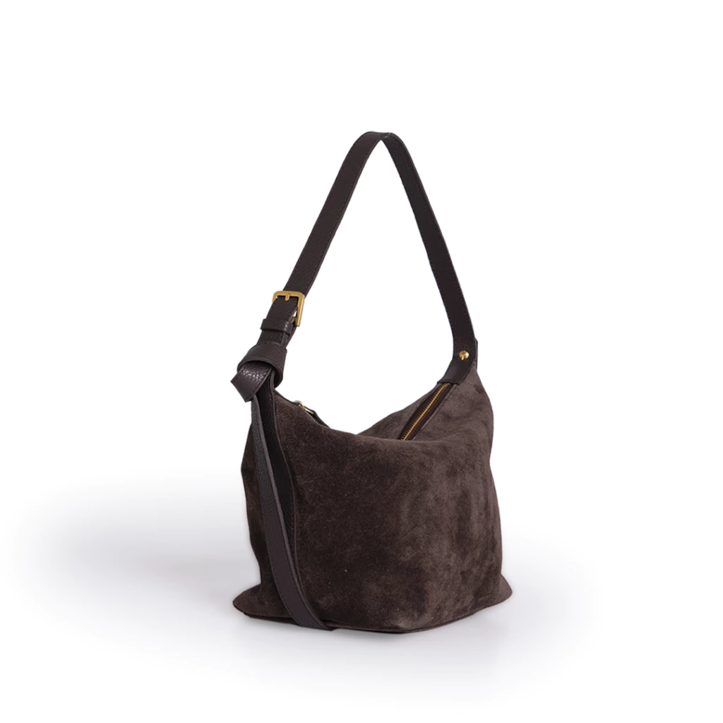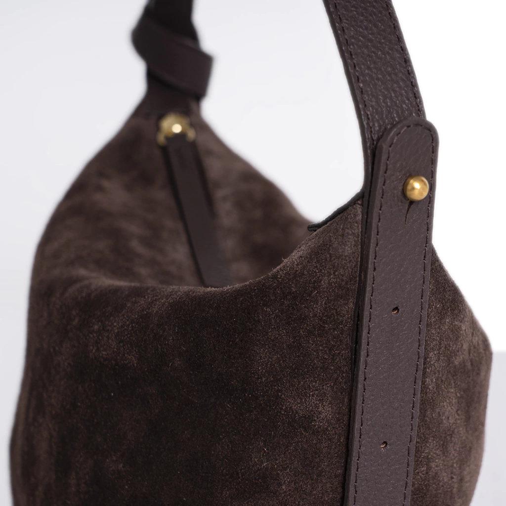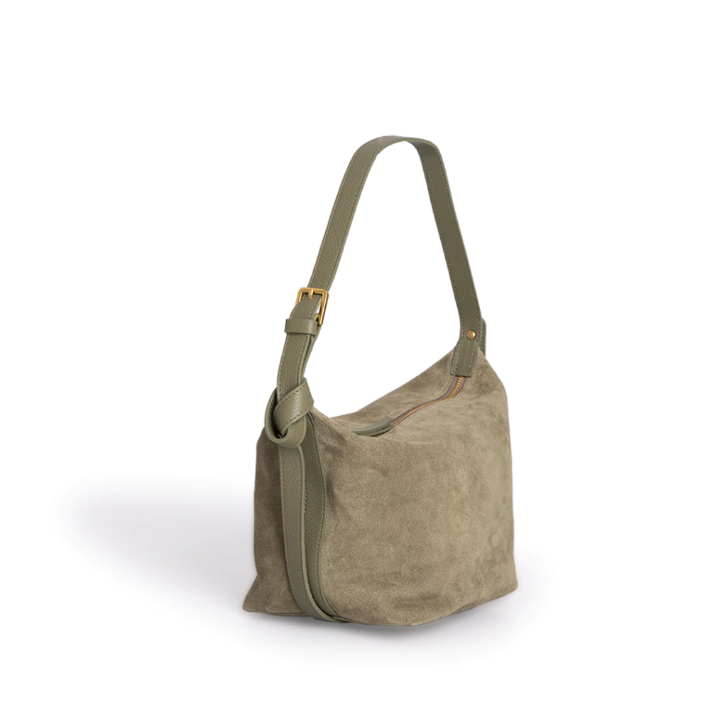 Cartera de gamuza con correa de cuero vacuno. Está forrada en tela . Cierre superior. Detalle en la correa con hebilla dorada y nudo con la propia tira. La misma es regulable para usar de bandolera o cartera de hombro.