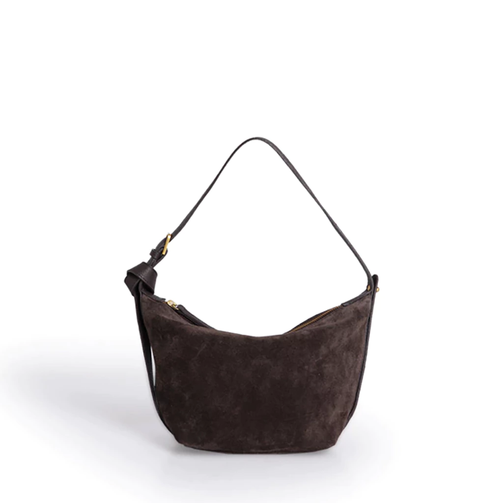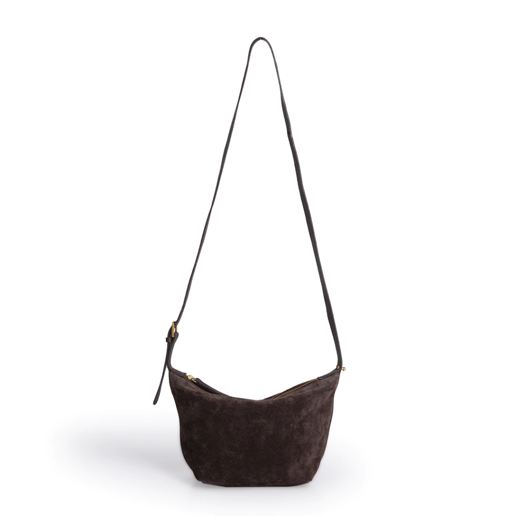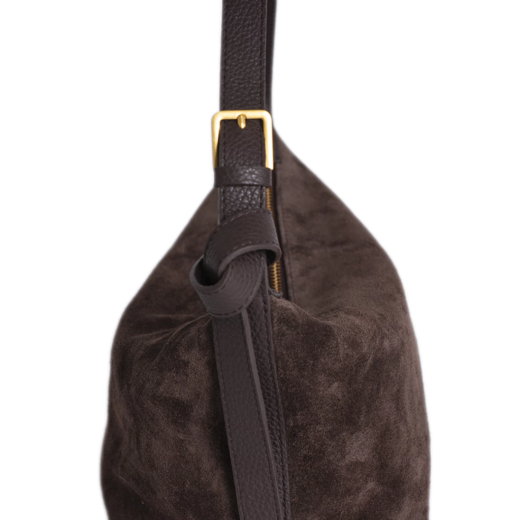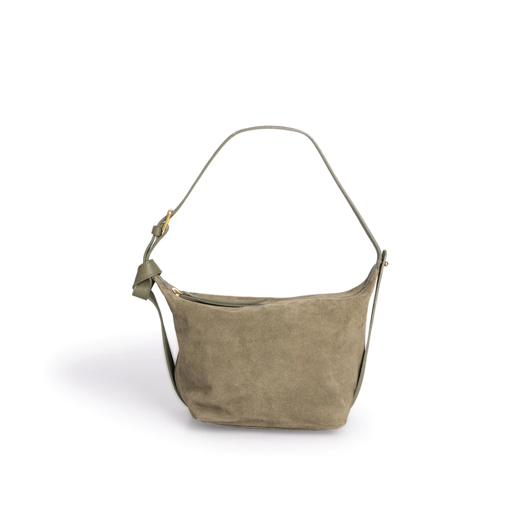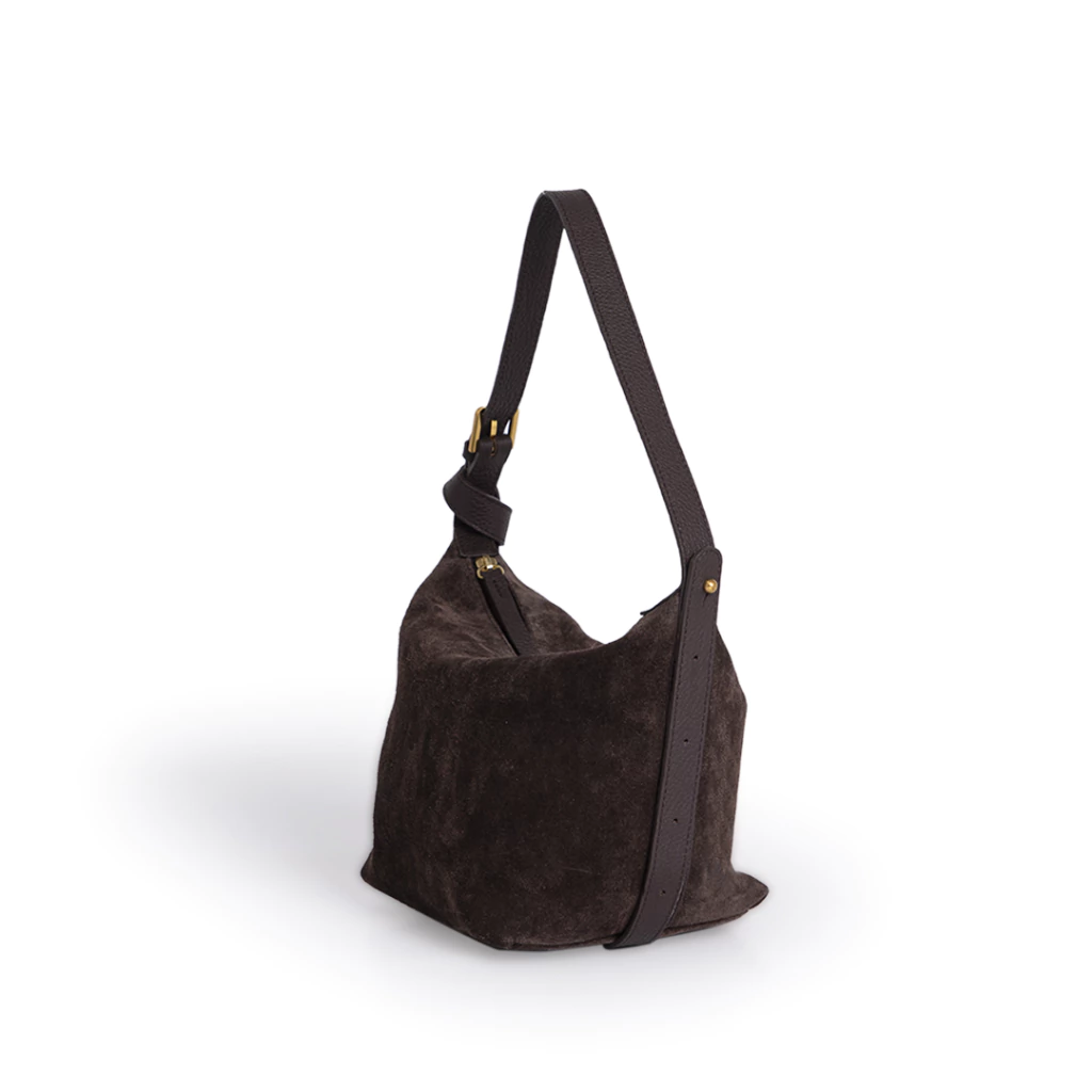 Cartera de gamuza con correa de cuero vacuno. Está forrada en tela . Cierre superior. Detalle en la correa con hebilla dorada y nudo con la propia tira. La misma es regulable para usar de bandolera o cartera de hombro.