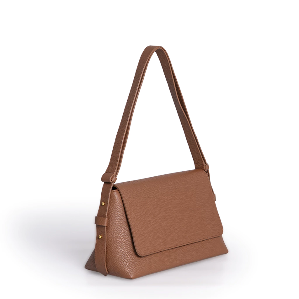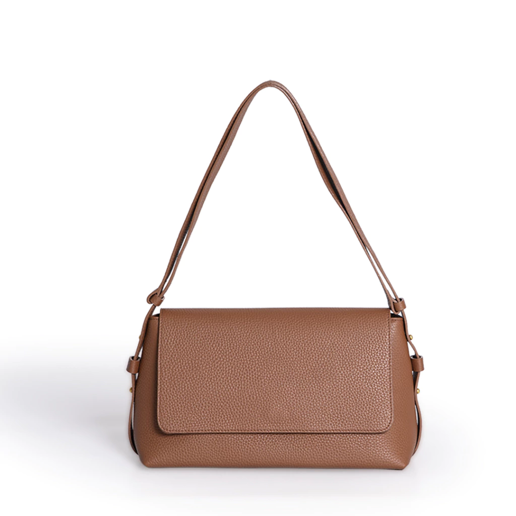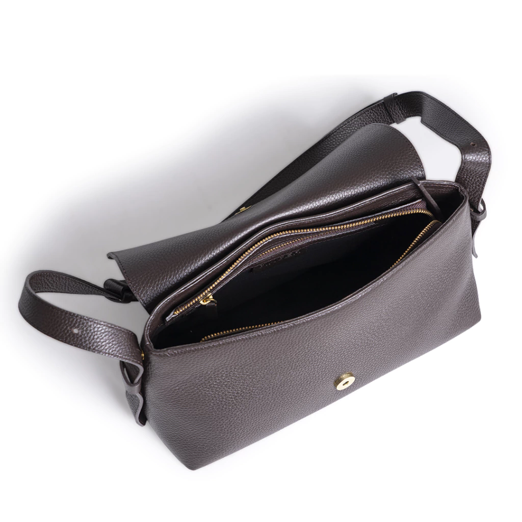 Cartera de cuero graneado. La correa es desmontable y regulable, se puede usar tanto de bandolera como de hombro. Esta forrada y tiene un bolsillo interno con cierre. Se cierra con cierre y también broche imán en la solapa.