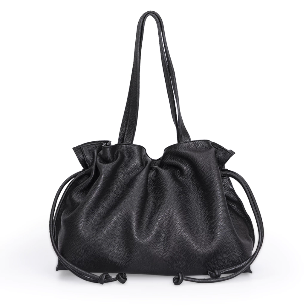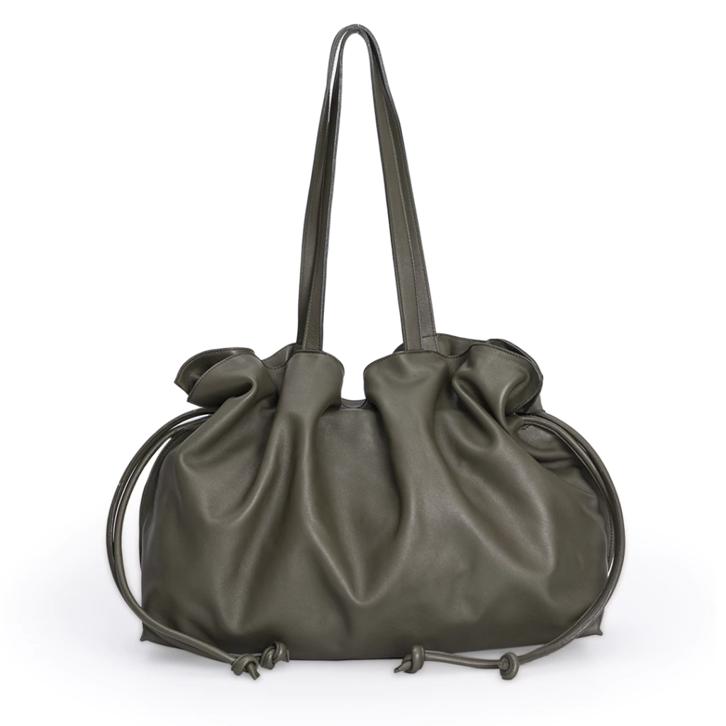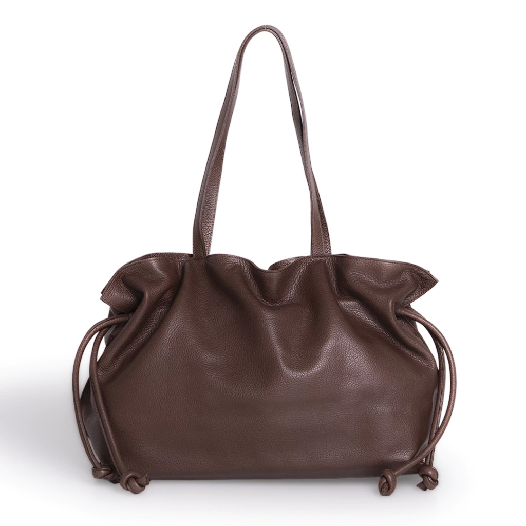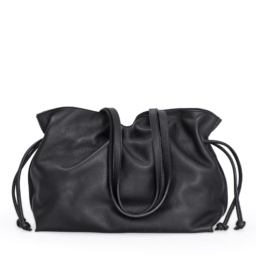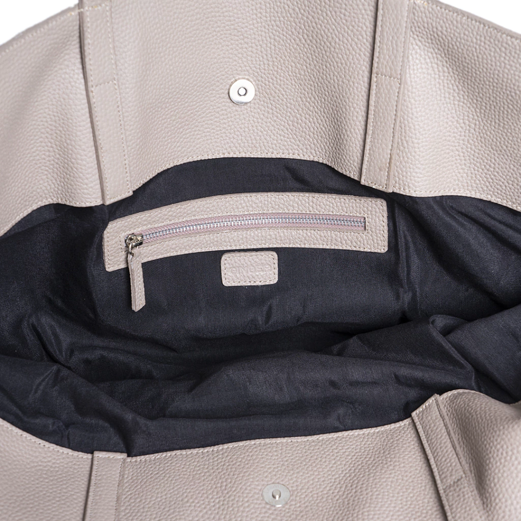Maxi Tote de cuero graneado. Está forrada por dentro y trae un bolsillo con cierre. Se cierra con broche iman y tambien con las correas de los costados se ajusta.